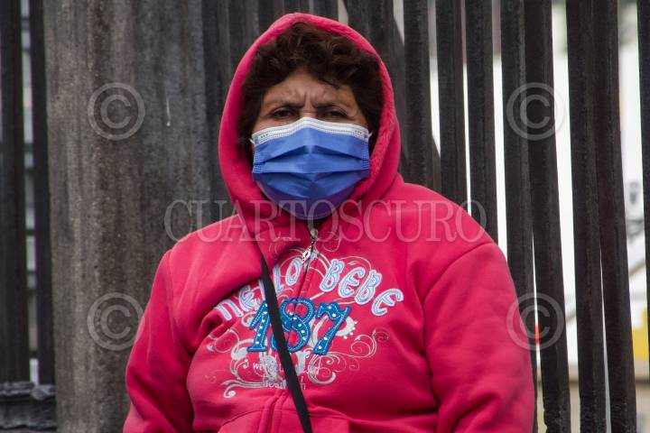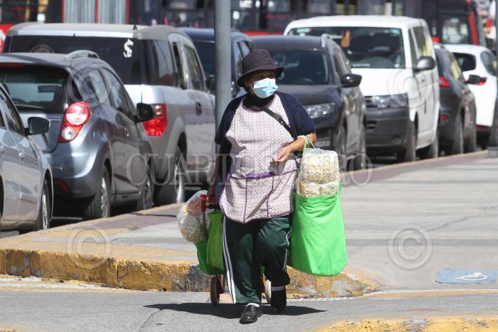 Una señora, vende papas y palomitas bajo los intensos rayos del sol.