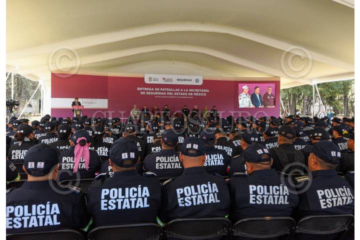 TOLUCA, ESTADO DE MÉXICO, 29ENERO2025.- Delfina Gómez Álvarez, Gobernadora del Estado de México, acompañada por Cristóbal Castañeda Camarillo, Secretaria de Seguridad, Horacio Duarte, Secretario General de Gobierno, Ricardo Moreno, Alcalde de Toluca realizó la entrega de 100 patrullas equipadas a la Secretaría de Seguridad, sumando hasta el momento 200 unidades que forman parte de la estrategia para fortalecer la seguridad pública estatal, durante este evento se guardó un minuto de silencio por los policías asesinados la noche de este martes en Malinalco; Máximo Martínez obispo auxiliar de la Arquidiócesis de Toluca bendijo las patrullas y pidió por la seguridad de los elementos estatales. FOTO: CRISANTA ESPINOSA AGUILAR /CUARTOSCURO.COM