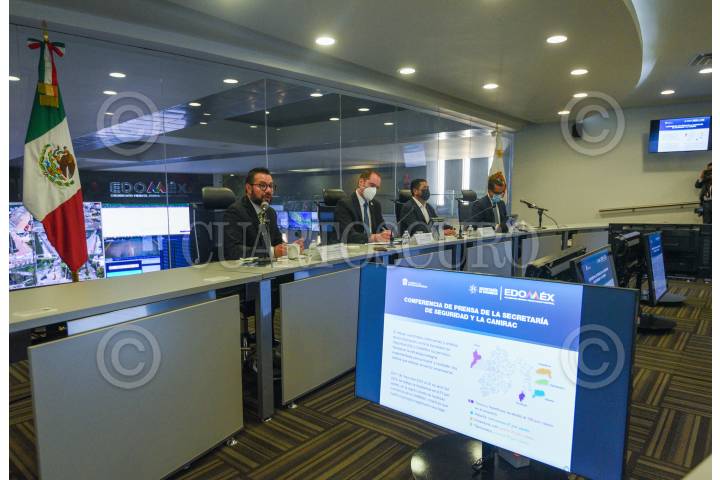 Conferencia de prensa trabajos coordinados para inhibir la delincuencia Rodrigo Sigfrid Martinez-Celis Wogau Secretario de Seguridad del Estado de México acompañado por Gilberto Javier Sauza Martínez Presidente del Consejo de Cámaras y Asociaciones Empresariales del Edomex y Mauricio Massud Martínez Presidente de CANIRAC en el Estado de México.