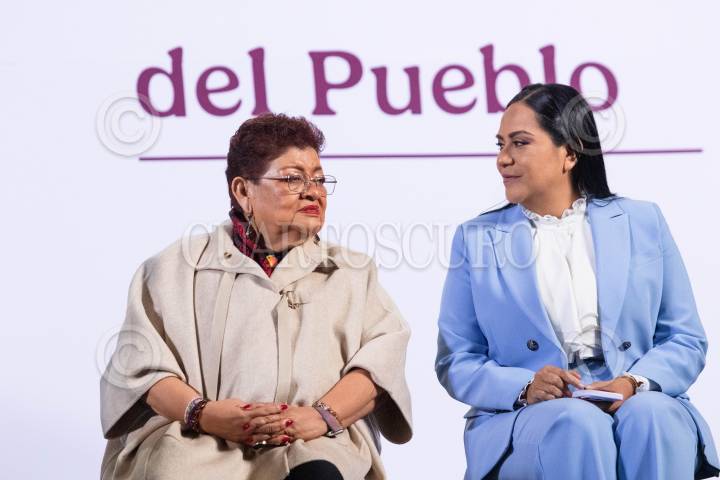 CIUDAD DE MÉXICO, 02DICIEMBRE2024.- Ernestina Godoy, Consejera Jurídica de la Presidencia, y Ariana Montiel, secretaria del Bienestar, conversan durante la mañanera en Palacio Nacional. FOTO: MOISÉS PABLO/CUARTOSCURO.COM