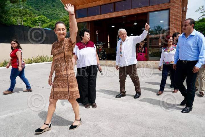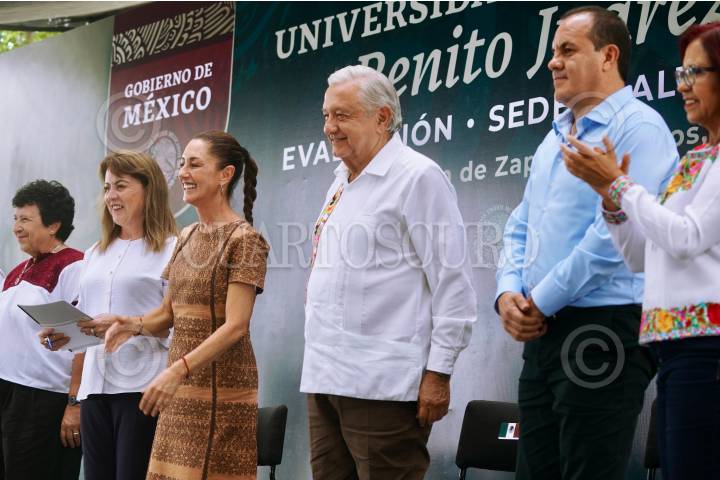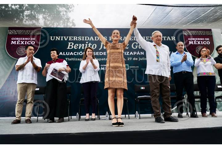 TLALTIZAPÁN DE ZAPATA, MORELOS, 27JULIO2024.- Andrés Manuel López Obrador, presidente de México, y Claudia Sheinbaum Pardo virtual presidenta electa, supervisaron los trabajos de las Universidades para el Bienestar “Benito Juárez García” en el plantel Tlaltizapán. Ambos estuvieron acompañados por: Jair Díaz Hurtado, coordinador académico del Plantel Tlaltizapán de las Universidades para el Bienestar “Benito Juárez García”; Raquel Sosa Elízaga, directora general de las Universidades para el Bienestar “Benito Juárez García”; Margarita González Saravia, gobernadora electa del Estado de Morelos; Cuauhtémoc Blanco Bravo, gobernador Constitucional del Estado de Morelos; Leticia Ramírez Amaya, secretaria de Educación Pública y Juan Pablo de Botton Falcón, subsecretario de Egresos de la Secretaría de Hacienda y Crédito Público. FOTO: PRESIDENCIA/CUARTOSCURO.COM