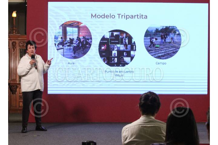Luisa Maria Alcalde, encabezó la conferencia de Bienestar en el Salón Tesorería de Palacio Nacional. FOTO: ROGELIO MORALES /CUARTOSCURO.COM