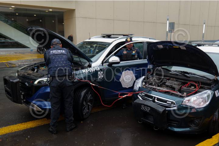 CIUDAD DE MÉXICO, 22JULIO2024.- Un elemento de la Secretaría de Seguridad Pública (SSP) intentó encender la batería de su patrulla con la ayuda de otra patrulla, ya que la suya se quedó sin funcionamiento. FOTO: ALICE MORITZ/CUARTOSCURO.COM