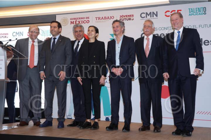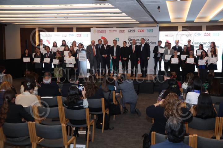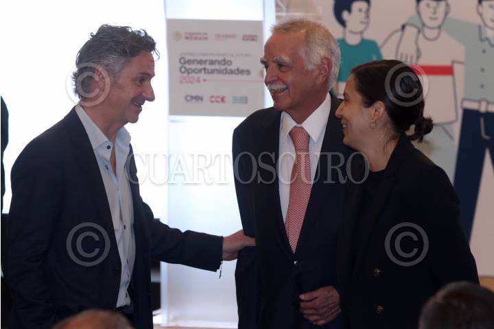 CIUDAD DE MÉXICO, 01FEBRERO2024. Pablo González, Rolando Vega Sáenz y Quiahuitl Chávez Domíngue durante su participación en el evento Jóvenes Construyendo el Futuro: Generando Oportunidades 2024, donde se entregaron reconocimientos a empresas participantes en este programa, en el Club de Industriales. FOTO: EDGAR NEGRETE LIRA/CUARTOSCURO.COM