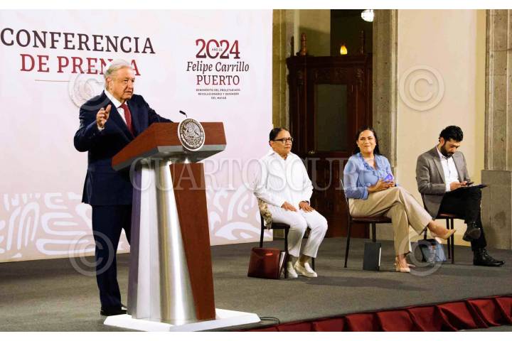 CIUDAD DE MÉXICO, 13JUNIO2024.- Andrés Manuel López Obrador, presidente Constitucional de los Estados Unidos Mexicanos en conferencia de prensa matutina en el Salón Tesorería de Palacio Nacional. Lo acompañan Rosa Icela Rodríguez Velázquez, secretaria de Seguridad y Protección Ciudadana; Ariadna Montiel Reyes, secretaria de Bienestar y Marath Bolaños López, secretario del Trabajo y Previsión Social. FOTO: PRESIDENCIA/CUARTOSCURO.COM