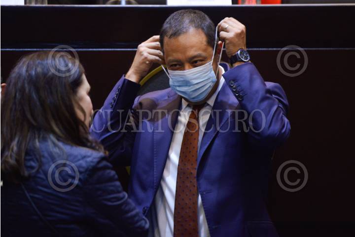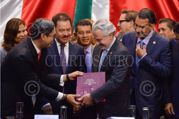 Erasmo González, presidente de la Comisión de Presupuesto y Cuenta Pública; Ignacio Mier, diputado y coordinador de Morena; Santiago Creel, presidente de la mesa directiva, y Luis Armando Melgar Bravo, presidente de la Comisión de Hacienda y Crédito Público, durante la entrega del Paquete Económico para el Ejercicio Fiscal 2023 a la Cámara de Diputados.