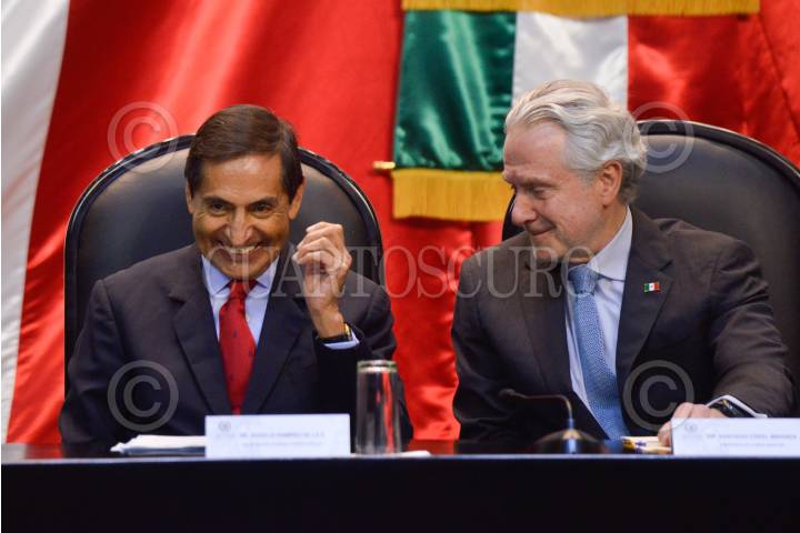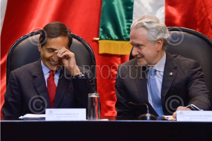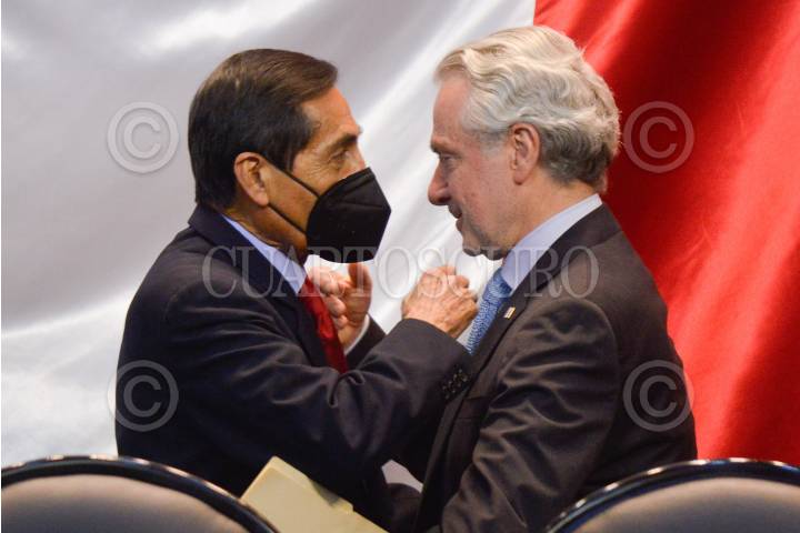 Rogelio Ramírez de la O, secretario de Hacienda y Crédito Público, y Santiago Creel, presidente de la mesa directiva, previo a la entrega del Paquete Económico para el Ejercicio Fiscal 2023 a la Cámara de Diputados.