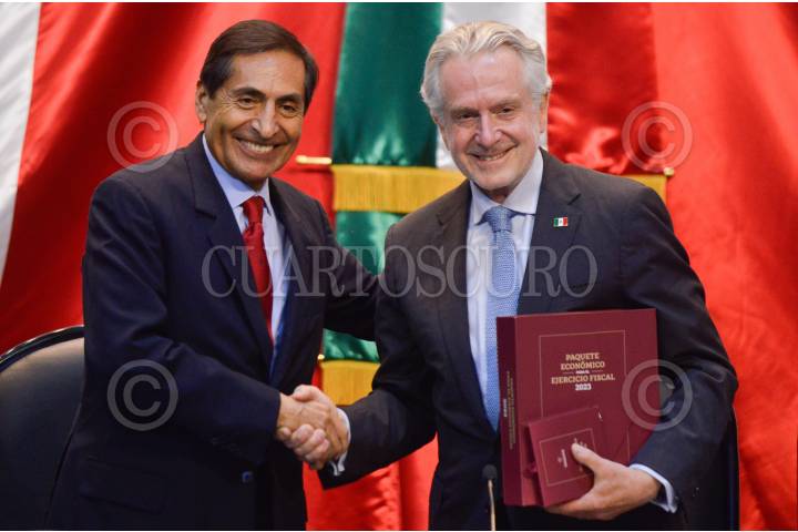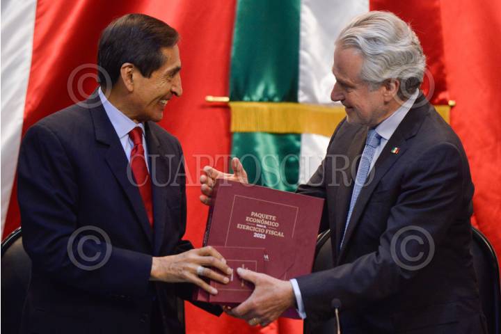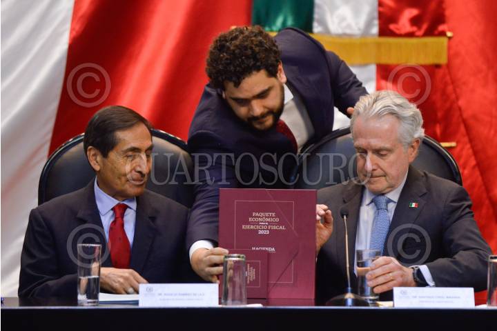 Rogelio Ramírez de la O, secretario de Hacienda y Crédito Público, entregó el Paquete Económico para el Ejercicio Fiscal 2023 a la Cámara de Diputados. Santiago Creel, presidente de la mesa directiva, e Ignacio Mier, presidente de la Junta de Coordinación Política (Jucopo) presidieron la recepción en el salón Legisladores de la República del Recinto Legislativo de San Lázaro.