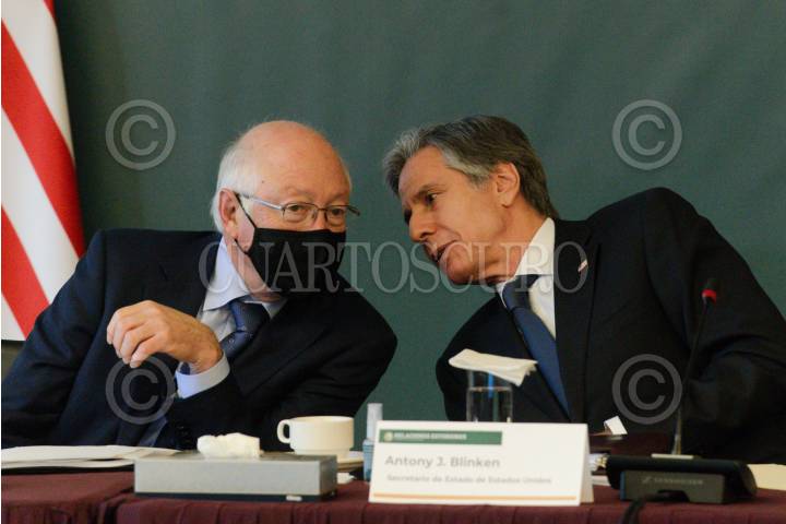 Ken Salazar, embajador de Estados Unidos en México, y Antony Blinken, secretario de Estado de los Estados Unidos, durante la reunión "Diálogo de Alto Nivel de seguridad México-Estados Unidos".