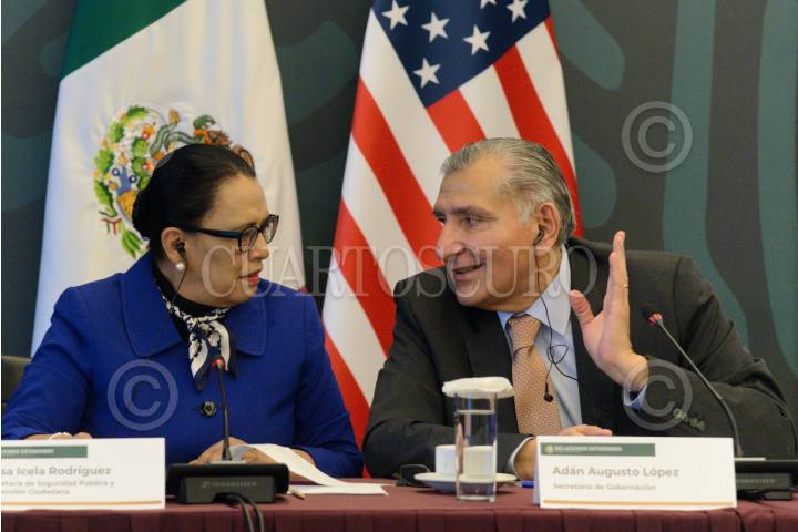 Rosa Icela Rodríguez, secretaría de Seguridad y Protección Ciudadana, y Adán Augusto López, secretario de Gobernación, durante la reunión "Diálogo de Alto Nivel de seguridad México-Estados Unidos".