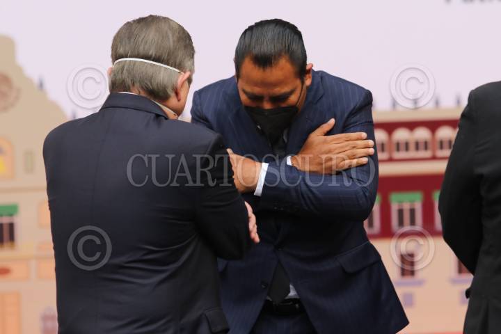 María Luisa Albores, titular de la Semarnat, saluda con el brazo a Alfonso Romo, Jefe de la Oficina de la Presidencia, durante el Segundo Informe del Presidente de México, Andrés Manuel López Obrador.