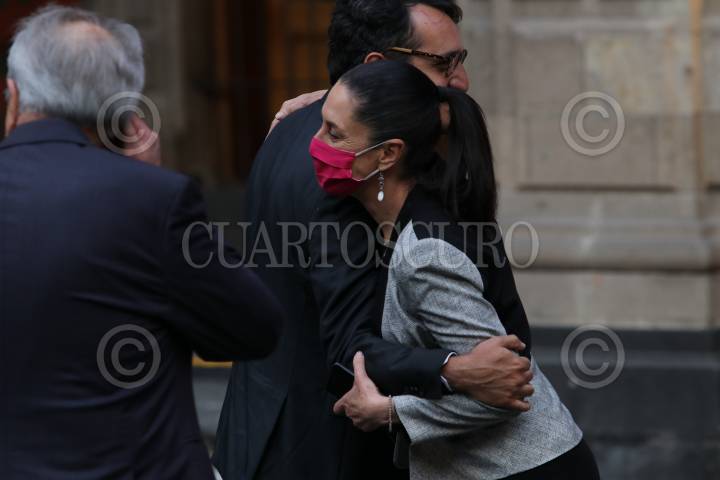 Andrés Manuel López Beltrán, hijo del Presidente de México, saluda de abrazo a Claudia Sheinbaum, Jefa de Gobierno, durante el Segundo Informe del Presidente de México, Andrés Manuel López Obrador.