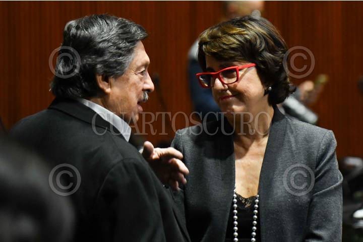 CIUDAD DE MÉXICO, 10DICIEMBRE2024.- Napoleón Gómez Urrutia, diputado de Morena, dialoga con Patricia Mercado, diputada de Movimiento Ciudadano, durante la segunda sesión ordinaria de la Cámara de Diputados en la que se sometió a discusión el dictamen en materia de plataformas digitales y los dictámenes que expiden la Ley Orgánica del Poder Judicial de la Federación y la Ley de Carrera Judicial. FOTO: MARIO JASSO/CUARTOSCURO.COM