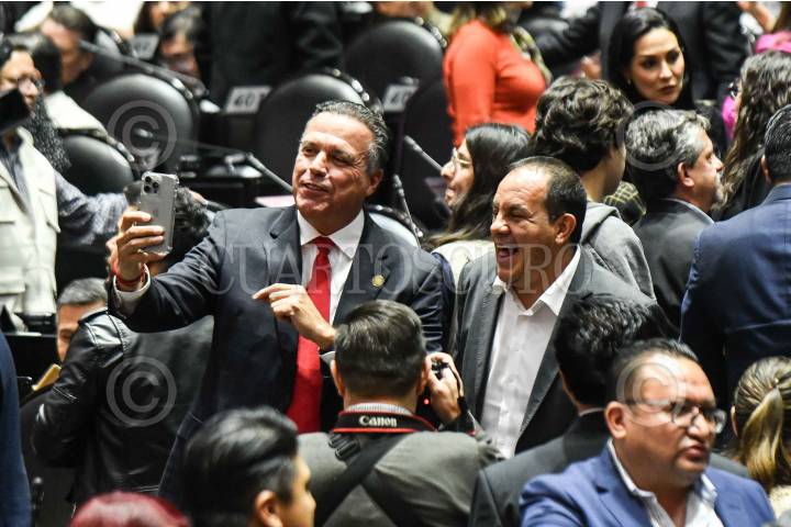 CIUDAD DE MÉXICO, 10DICIEMBRE2024.- Mauricio Cantú, diputado del PRI, se toma una fotografía junto a Cuauhtémoc Blanco, diputado de Morena, durante la segunda sesión ordinaria en la que se sometió a discusión el dictamen en materia de plataformas digitales y los dictámenes que expiden la Ley Orgánica del Poder Judicial de la Federación y la Ley de Carrera Judicial. FOTO: MARIO JASSO/CUARTOSCURO.COM