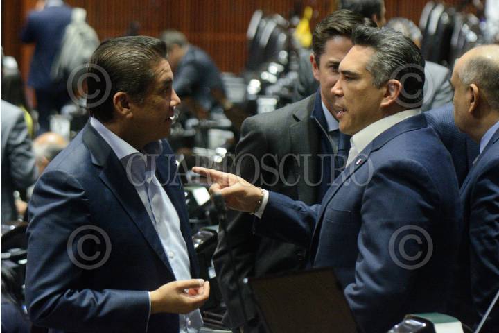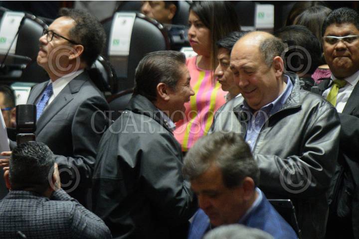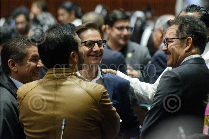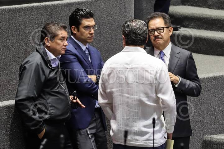 Los coordinadores parlamentarios: Carlos Puente (PVEM); Jorge Romero (PAN); Ignacio Mier (Morena) y Luis Espinosa Cházaro (PRD), dialogan durante la sesión ordinaria de la Cámara de Diputados.
