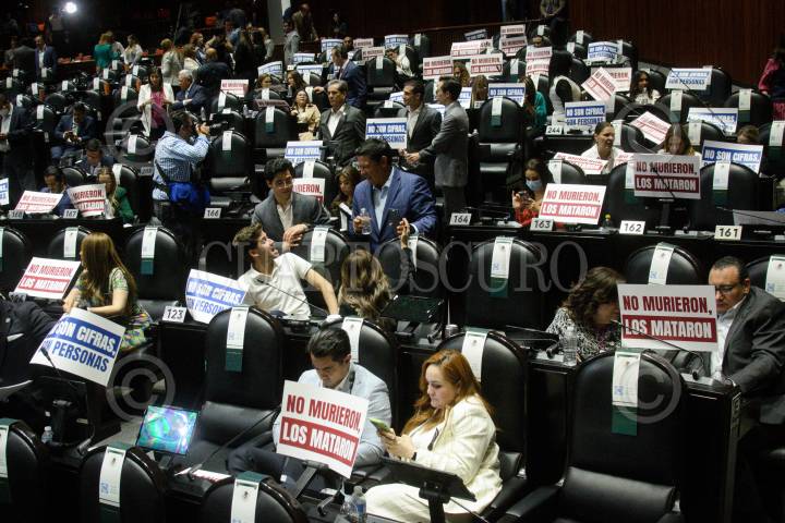 Diputados del grupo parlamentario del PAN, colocaron en sus curules cartulinas en protesta por los migrantes fallecidos en Ciudad Juárez, Chihuahua.