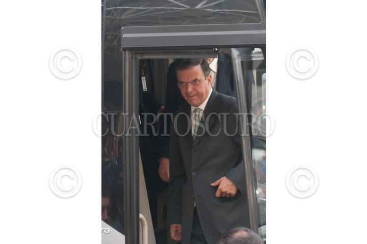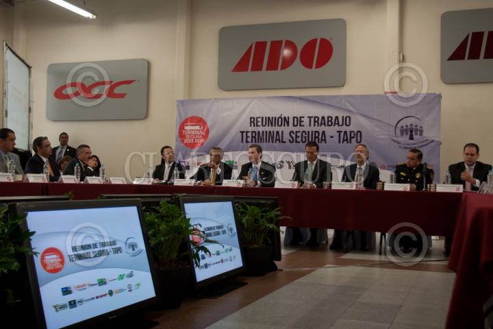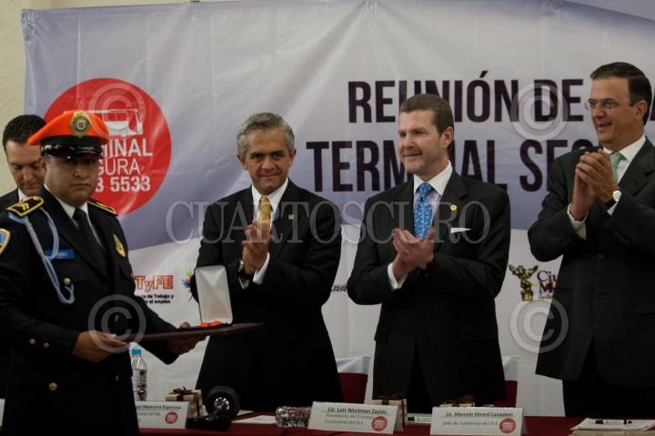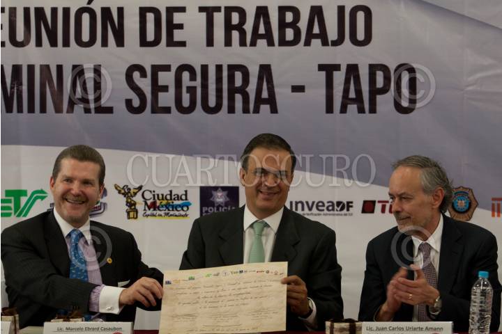 MÉXICO, D.F., 16AGOSTO2011.- Marcelo Ebrard, Jefe del Gobierno capitalino acompañado de Miguel Ángel Mancera Procurador del D.F., Luis Wertman Zaslav, Presidente del Consejo Ciudadano del D.F. y Juan Carlos Uriarte Amann, Presidente del Consejo de Administración de la Terminal TAPO, encabezo la firma y presentación del convenio Programa Terminal Segura, en las instalaciones de ADO. FOTO: GUILLERMO PEREA/CUARTOSCURO.COM
