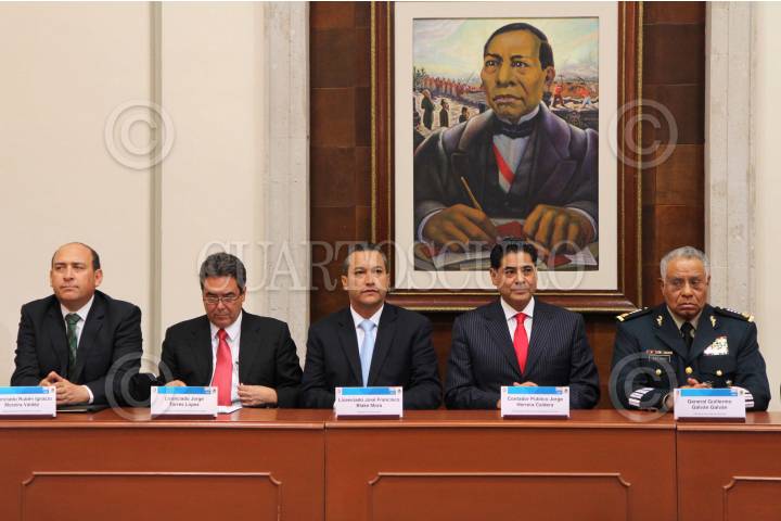 MÉXICO, D.F., 20OCTUBRE2011.- Esta mañana, José Francisco Blake Mora, secretario de gobernación; Alejandra Sota, vocera del gobierno federal; el gobernador electo de Coahuila, Rubén Moreira Valdez; y los gobernadores constitucionales Coahuila, Jorge Torres López y Durango, Jorge Herrera Caldera; para hablar sobre el nuevo operativo conjunto de seguridad Laguna Segura. FOTO: CUARTOSCURO.COM