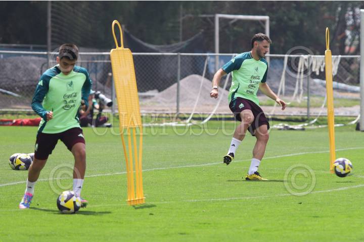 CIUDAD DE MÉXICO, 04JUNIO2025.- Santiago Giménez y Gilberto Mora, durante el entrenamiento de esta mañana con la selección mexicana en el Centro de Alto Rendimiento (CAR), previo a los duelos que sostendrán frente a las selecciones de Suiza y Turquía en Estados Unidos. FOTO: DANIEL AUGUSTO/ CUARTOSCURO.COM