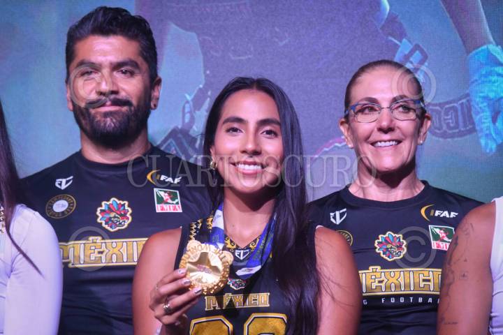 CIUDAD DE MÉXICO, 22AGOSTO2025.- Medalla de la Selección Mexicana Femenil de Flag Football que resultó campeona en los World Games 2025, durante conferencia de prensa en el marco de las actividades del Gamergy Telcel realizado en las instalaciones de la Expo Santa Fe. FOTO: MARIO JASSO/CUARTOSCURO.COM