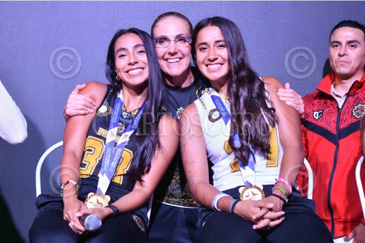 CIUDAD DE MÉXICO, 22AGOSTO2025.- Diana Flores y Allison Salazar, de la Selección Mexicana Femenil de Flag Football que resultó campeona en los World Games 2025, durante conferencia de prensa en el marco de las actividades del Gamergy Telcel realizado en las instalaciones de la Expo Santa Fe. FOTO: MARIO JASSO/CUARTOSCURO.COM