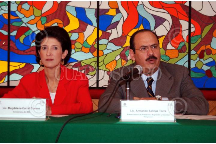 México D.F., 08DIC2004.- El subsecretario de población, migración y de asuntos religiosos de la secretaria de Gobernación, Armando Salinas Torre, inauguro el 4to Seminario de Extranjeros en México. En la imagen lo acompaña Magdalena Corral. FOTO: Ignacio González/CUARTOSCURO.COM