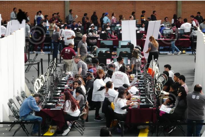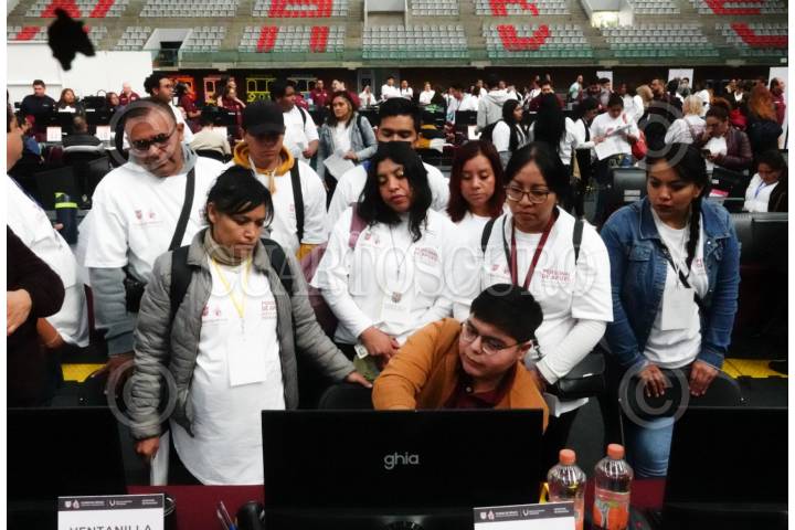 CIUDAD DE MÉXICO, 16NOVIEMBRE,2024.- Personal de apoyo recibe instrucciones para auxiliar a los conductores que acudan al macromódulo instalado por la Secretaria de Movilidad (Semovi) en Ciudad Deportiva, Magdalena Mixhuca para tramitar su licencia permanente. FOTO: MAGDALENA MONTIEL/CUARTOSCURO.COM