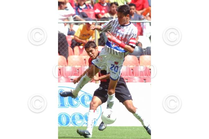 MEXDF 09 MAYO 2004.- Fernando Infante de los Gallos Blancos de Querétaro se disputa el balón con Paulo Serafín de Los Potros del Atlante durante el partido que se disputo en el Estadio Azteca. FOTO: Eunice Adorno/CUARTOSCURO.COM