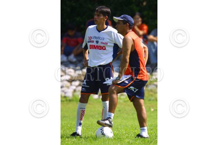MONTERREY, NUEVO LEON 03AGOSTO2004.- El jugador Paulo Serafín observa a sus compañeros junto al preparador fisico del equipo Rayados de Monterrey durante el entrenamiento matutino. FOTO: Jorge López/CUARTOSCURO.COM