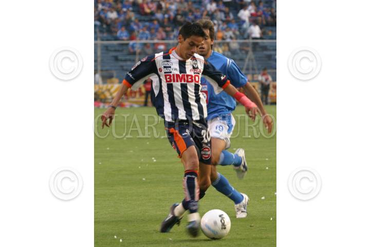 MEXICO, D.F. 29ENERO2005.- César Delgado del Cruz Azul se disputa el balón de juego con Paulo Serafín de los Rayados de Monterrey, durante su encuentro en el estadio azul. FOTO: Nelly Salas/CUARTOSCURO.COM