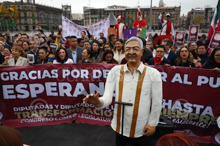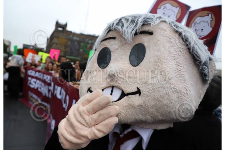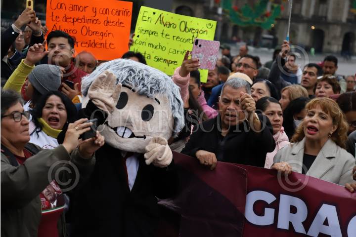 CIUDAD DE MÉXICO, 30SEPTIEMBRE2024.- Una botarga del presidente de México, Andrés Manuel López Obrador, es llevada por sus simpatizantes para la despedida del mandatario mexicano. FOTO: DANIEL AUGUSTO/ CUARTOSCURO.COM