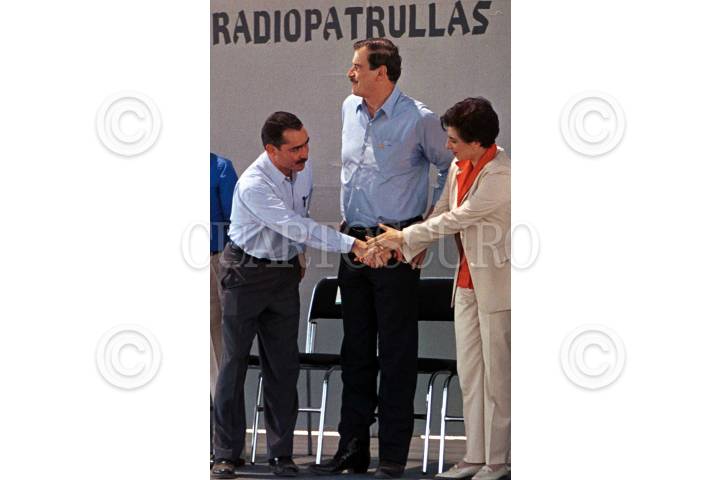 Ante la presencia del Gobernador de Morelos, Sergio Estrada Cajigal, y la Secretaria de Turismo, Leticia Navarro, Vicente Fox Quesada acudió a la entrega de 312 radiopatrullas para los "Angeles Verdes". FOTO: Christian Palma/CUARTOSCURO.COM