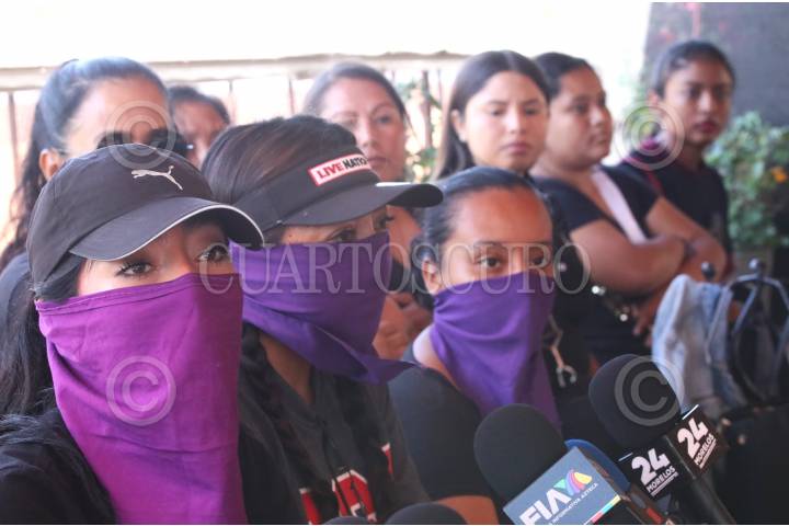 CUERNAVACA, MORELOS, 27MAYO2024.- Conferencia de prensa del "Frente Latinoamericano por la participación de las mujeres" para pedir un voto razonado el próximo dos de junio. Las feministas convocaron a toda la ciudadanía a no votar por candidatos que sean deudores alimentarios o que tengan denuncias por agresión contra mujeres; citaron el caso de Sergio Estrada Cajigal, exgobernador y candidato a una diputación federal y el de Eder Casillas, candidato a presidente municipal, ambos de la coalición integrada por los partidos PAN, PRD, PRI y el partido local Redes Sociales Progresistas. FOTO: MARGARITO PÉREZ RETANA/CUARTOSCURO.COM