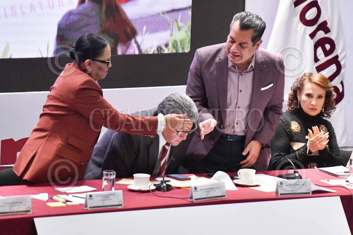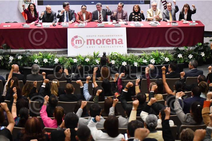 CIUDAD DE MÉXICO, 31ENERO2025.- Pedro Haces, diputado; Rosa Icela Rodríguez, secretaria de Gobernación; Ricardo Monreal, diputado y coordinador del grupo parlamentario de Morena en la Cámara Baja, y Sergio Gutiérrez, presidente de la mesa directiva, durante la apertura de la segunda reunión plenaria del grupo parlamentario de Morena previo al segundo periodo de sesiones ordinarias de la LXVI Legislatura, realizada en el Auditorio Aurora Jiménez de la Cámara de Diputados. FOTO: MARIO JASSO/CUARTOSCURO.COM