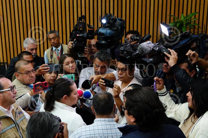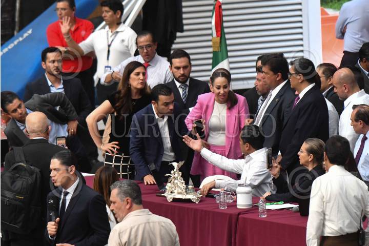 CIUDAD DE MÉXICO, 03SEPTIEMBRE2024.- Los diputados panistas: Elías Lixa, Noemi Berenice Luna y Kenia López, reclaman a Sergio Gutiérrez Luna, presidente de la mesa directiva, durante el inicio de la sesión ordinaria en la sede alterna "Sala de Armas" en la que se comienza la discusión de la iniciativa de reforma al Poder Judicial. FOTO: MARIO JASSO/CUARTOSCURO.COM