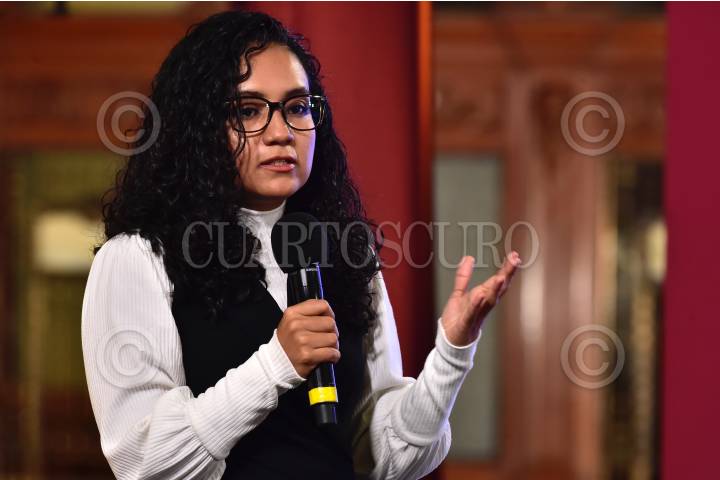 Sergio Juárez Plata y Cetia Itzel Narváez Coronado durante la conferencia de Créditos en Palacio Nacional.