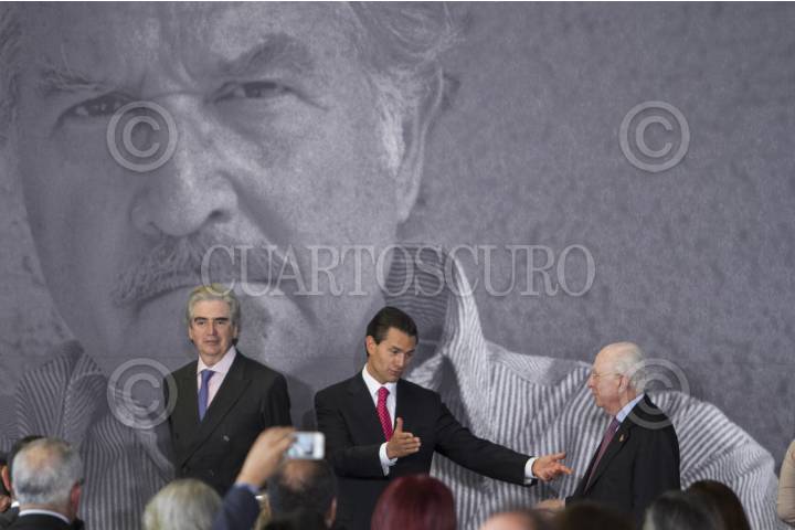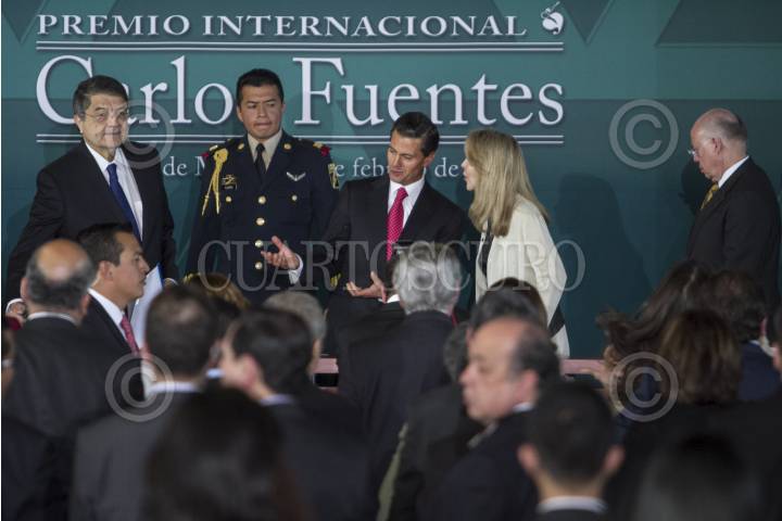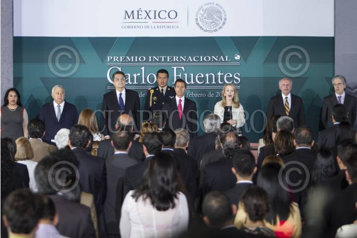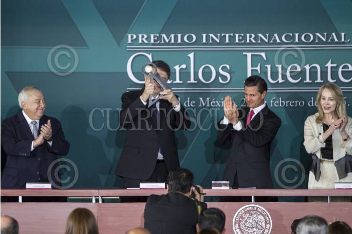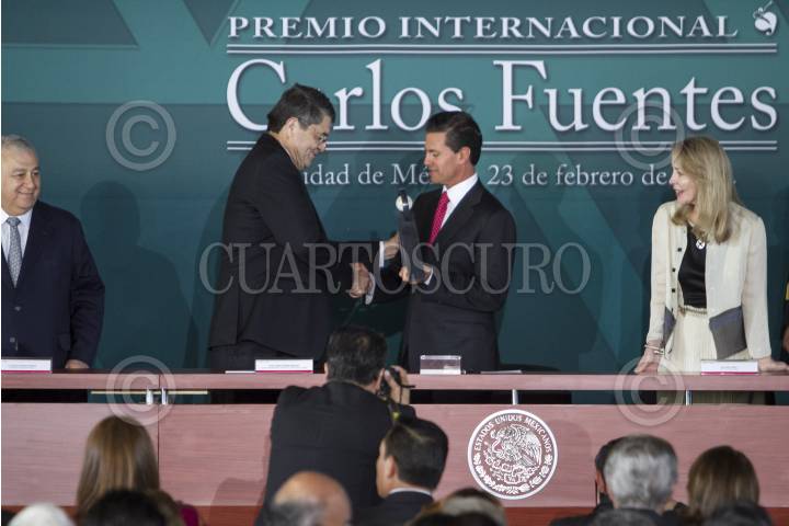 MÉXICO, D.F., 23FEBRERO2015.- El escritor nicaragüense Sergio Ramírez Mercado recibió hoy en México el Premio Internacional Carlos Fuentes a la Creación Literaria en Idioma Español. El autor y ganador del Premio Alfaguara, recibió el galardón de manos del presidente Enrique Peña Nieto, en presencia de la viuda de Fuentes, Silvia Lemus, José Narro Robles, rector de la UNAM, Emilio Chuayffet, secretario de Educación Publica, Rafael Tovar y de Teresa, director de CONACULTA. FOTO: ISABEL MATEOS /CUARTOSCURO.COM
