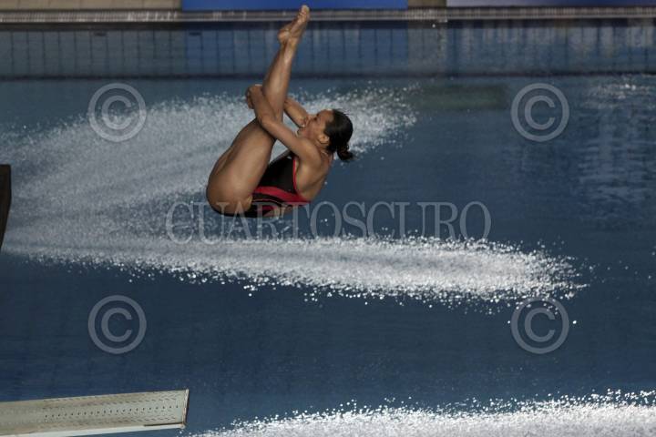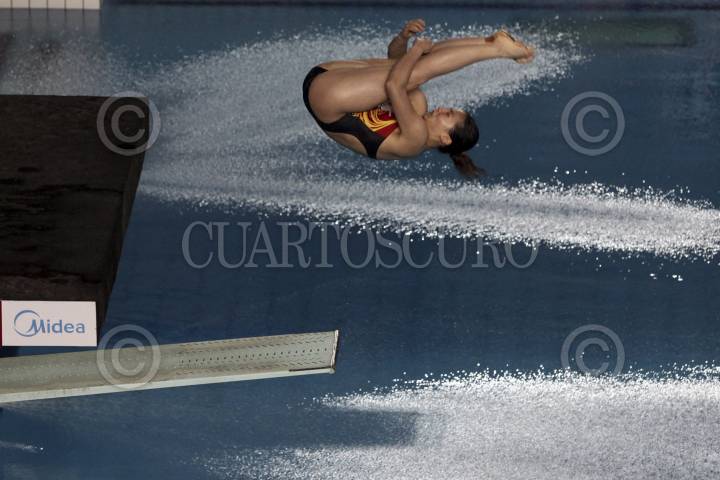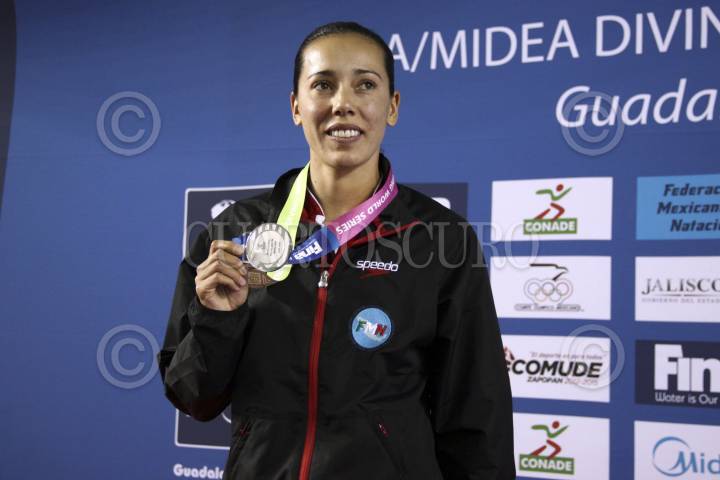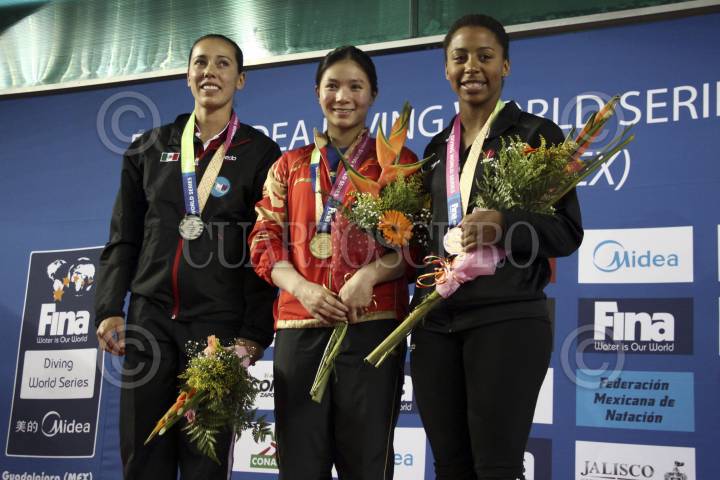 ZAPOPAN, JALISCO, 18MAYO2013.- Esta tarde en el segundo día de actividades de Serie Mundial de Clavados que se lleva a cabo en el Complejo Acuático Scotiabank de esta ciudad, la clavadista Laura Sánchez consiguió la medalla de plata en la prueba de Trampolín de 3 metros femenil, en tanto la china Zi He se llevo la de oro y la canadiense Jennifer Abel la de bronce. FOTO: FERNANDO CARRANZA GARCÍA /CUARTOSCURO.COM