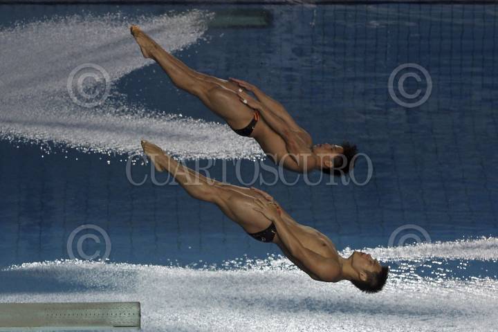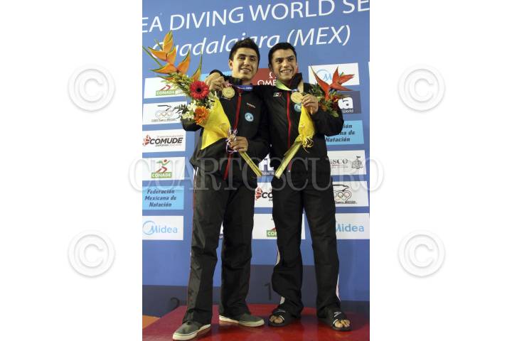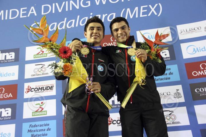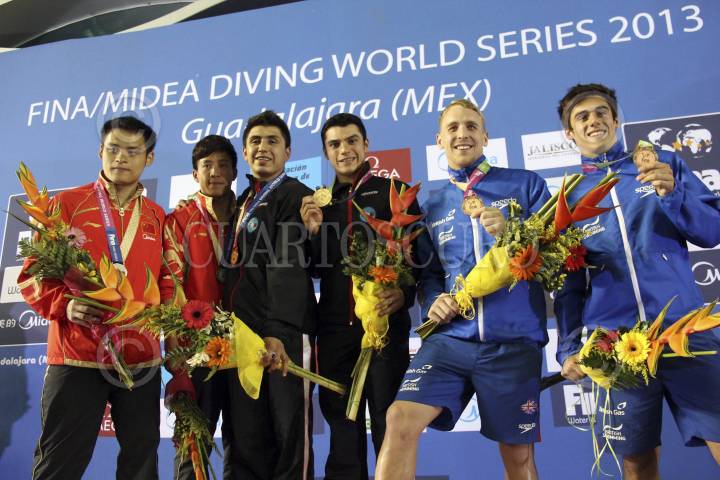 ZAPOPAN, JALISCO, 24MAYO2013.- Esta tarde se llevaron a cabo las finales de Clavados Sincronizados en Trampolín de 3 metros Varonil, en donde los Mexicanos Yahel Castillo y Daniel Islas se llevaron la medalla de oro, los Chinos Shixin Li y Chao He la de plata, así como los Británicos Nicholas Baker Robinson y Christopher Mears la de la de bronce. FOTO: FERNANDO CARRANZA GARCÍA /CUARTOSCURO.COM