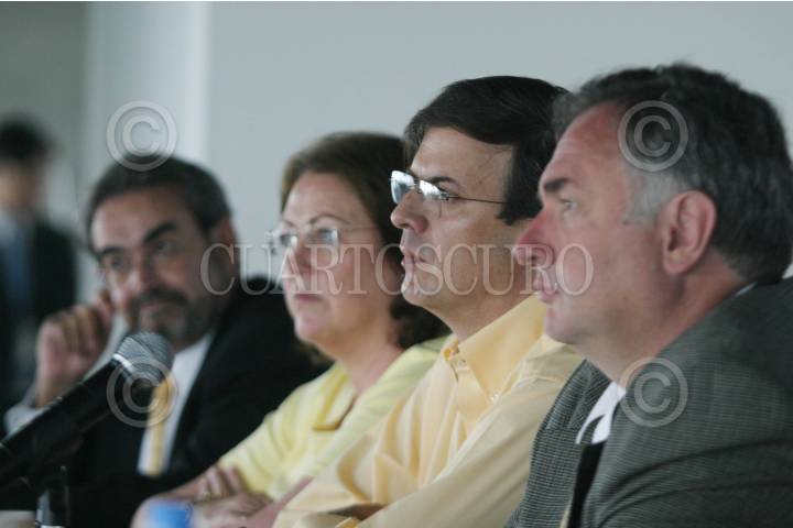 MÉXICO D.F. 13MAYO2006.- Armando Subirats Simon, Elena Cepeda, Marcelo Ebrard y Jorge Serra Moreno, durante las conclusiones del Foro de Discusión sobre el Sistema Aeroportuario Metropolitano. FOTO: Diego Gallegos/CUARTOSCURO.COM