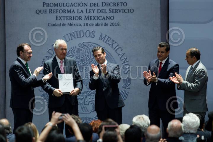 CIUDAD DE MÉXICO, 18ABRIL2018.- Luis Videgaray, secretario de Relaciones Exteriores; Bernardo Sepulveda Amor, condecorado como embajador emérito; Enrique Peña Nieto, presidente de la República; Edgar Romo, presidente de la Cámara de Diputados, y Ernesto Codero, presidente de la Cámara de Senadores, durante la promulgación del decreto que reforma la ley del Servicio Exterior Mexicano, en el Patio de Honor de Palacio Nacional. FOTO: GALO CAÑAS /CUARTOSCURO.COM