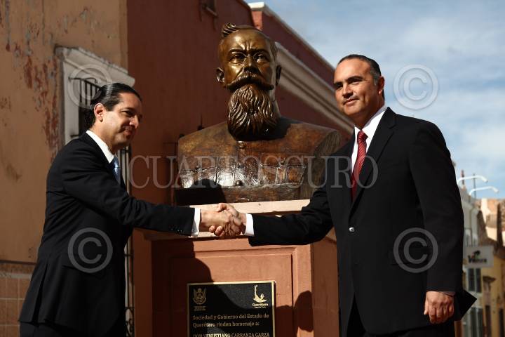 QUERÉTARO, QUERÉTARO, 05FEBRERO2011.- Francisco Dominguez Servien, Presidente Municipal de Queretaro y José Calzada Rovirosa, Gobernador del Estado, se saludan después de develar un busto de Venustiano Carranza (1859-1920), por la conmemoración del XCIV Aniversario de la Promulgación de la Constitución Política de los Estados Unidos Mexicanos. FOTO: MISAEL VALTIERRA/CUARTOSCURO.COM