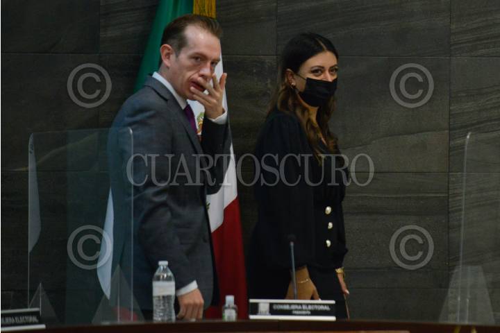 Ariadna González Morales, consejera presidenta temporal del Instituto Estatal Electoral (IEE) de Hidalgo, y José Guillermo Corrales Galván, consejero electoral, precio al inicio de la Sesión de Instalación de la Jornada Electoral para la elección de gubernatura en la entidad.