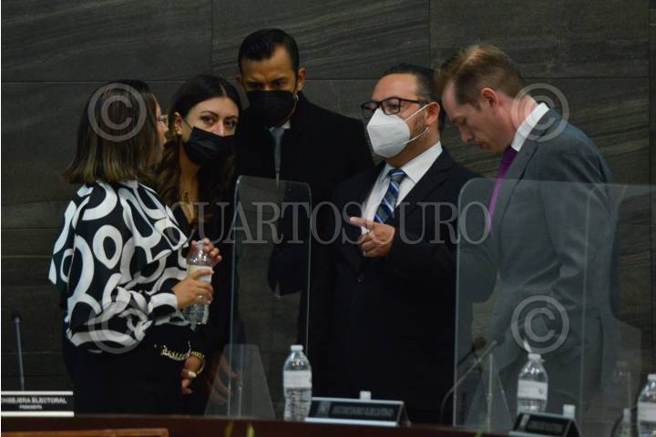 Ariadna González Morales, consejera presidenta temporal del Instituto Estatal Electoral (IEE) de Hidalgo, y los consejeros electorales: Miriam Saray Pachec; Alfredo Alcalá Montaño; Uriel Lugo Huerta; y José Guillermo Corrales Galván, previo al inicio de la Sesión de Instalación de la Jornada Electoral para la elección de gubernatura en la entidad.