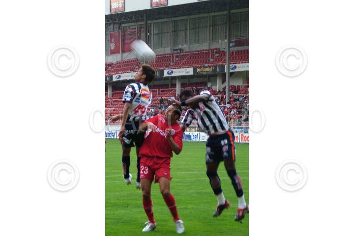 TOLUCA, ESTADO DE MEXICO, 11FEBRERO2006.- Severo Meza (Monterrey), José Manuel Abundis (Toluca) y Jesús Arellano (Monterrey) dispunta un balón durante el encuentro del partido de la quinta Jornada del torneo de Clausura 2006 en el que el equipo Monterrey venció al Toluca con un marcador de 1-0. FOTO:Noe Marure/CUARTOSCURO.COM