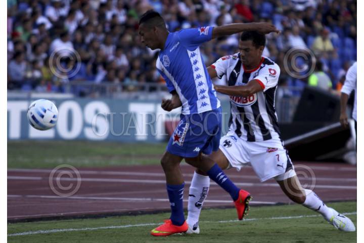 MONTERREY, NUEVO LEÓN, 23AGOSTO2014.- Severo Meza del equipo de los Rayados se disputa el balón contra Luis Esqueda del equipo del Puebla, en el estadio tecnológico, partido correspondiente a la jornada 6 de la Apertura 2014 de la Liga MX. FOTO: GABRIELA PÉREZ MONTIEL /CUARTOSCURO.COM