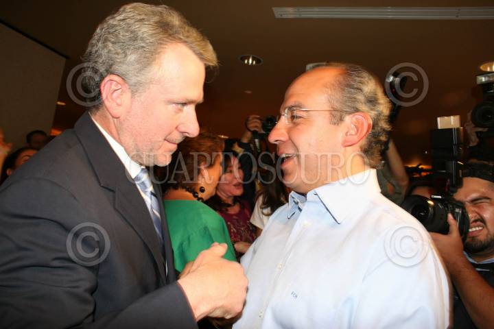 MÈXICO D.F. 06MARZO2006.- El panísta Santiago Creel y Felipe Calderon, candidato presidencial de Acción Nacional, durante la presentaciòn de la nueva campaña polìticaa la presidencia. FOTO: Diego Gallegos/CUARTOSCURO.COM