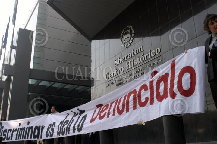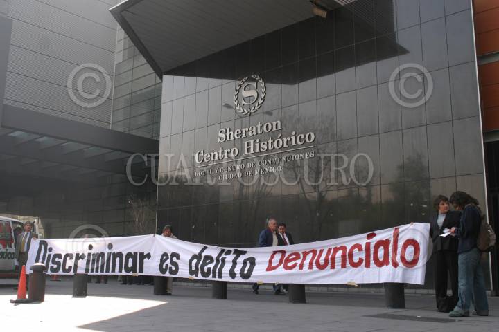 MEXICO, D.F., 09FEBRERO2006,- Continúan las protestas encontra de la cedena hotelera Sheraton, por la injustificada expulsión de diplomáticos cubanos de uno de sus hoteles. En la imagen una manta con la leyenda "Discriminar es Delito Denuncialo, en la puerta del Sheraton Centro Histórico". FOTO: Moisés Pablo/CUARTOSCURO.COM