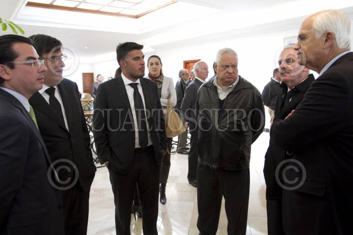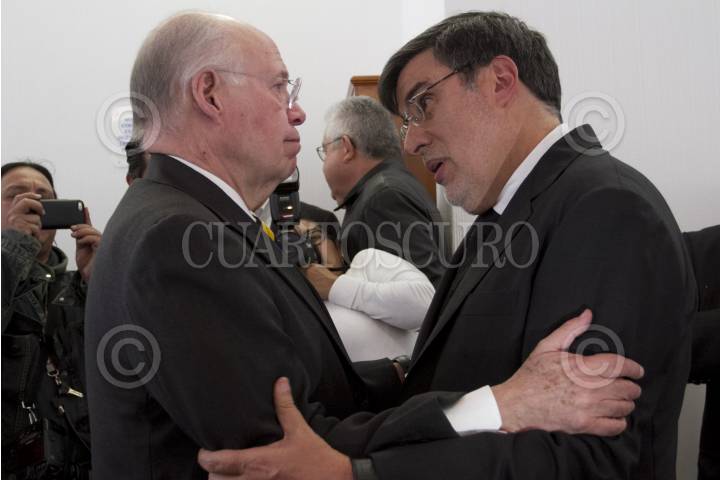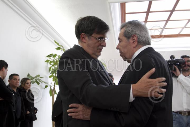 MÉXICO, D.F., 07ENERO2015.- José Narro Robles, Rector de la UNAM, da el pesame a Julio Scherer (Hijo) durante el funeral del periodista Julio Scherer García, quien falleciera esta madrugada, alrededor de las 4:30 horas de un choque séptico. Julio Scherer García fue un periodista y escritor mexicano, director del periódico Excélsior y del Semanario Proceso. FOTO: GUILLERMO PEREA /CUARTOSCURO.COM
