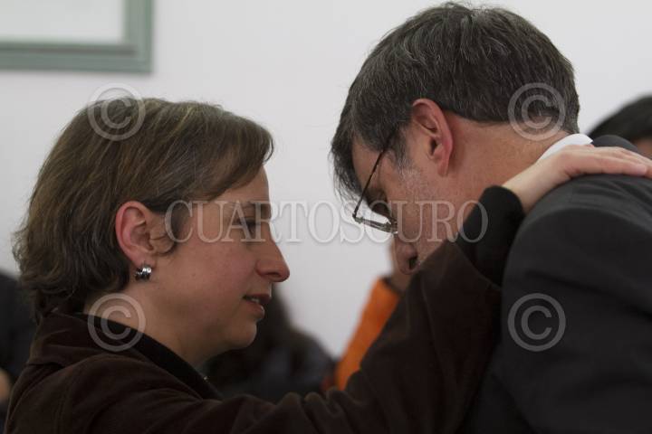 MÉXICO, D.F., 07ENERO2015.-La periodista Carmen Aristegui, da el pésame a Julio Scherer (Hijo) durante el funeral del periodista Julio Scherer García, quien falleciera esta madrugada, alrededor de las 4:30 horas de un choque séptico. Julio Scherer García fue un periodista y escritor mexicano, director del periódico Excélsior y del Semanario Proceso. FOTO: GUILLERMO PEREA /CUARTOSCURO.COM